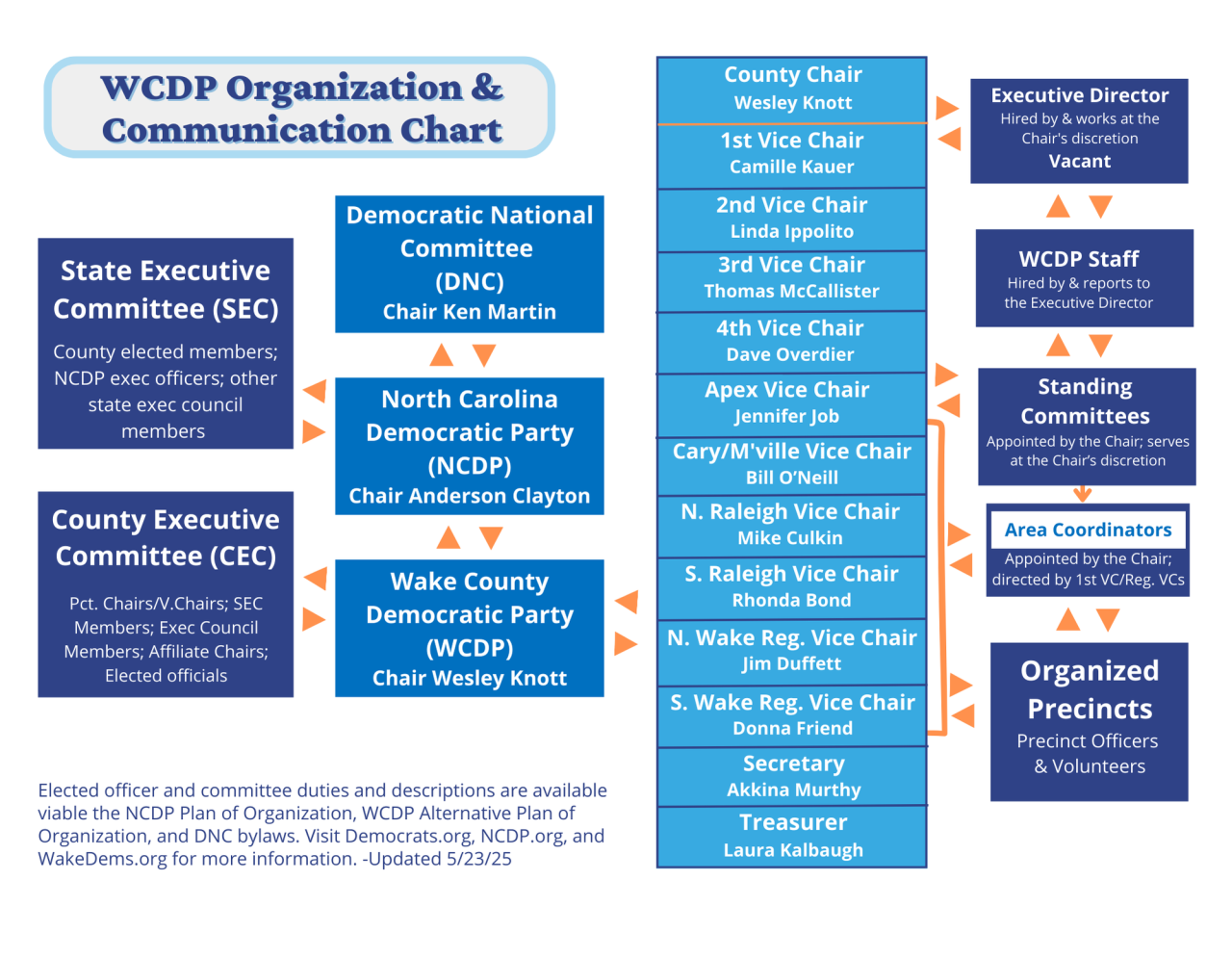The North Carolina Democratic Party governs WCDP through the state-wide Plan of Organization. We use an Alternative Plan of Organization to meet our County’s specific needs.