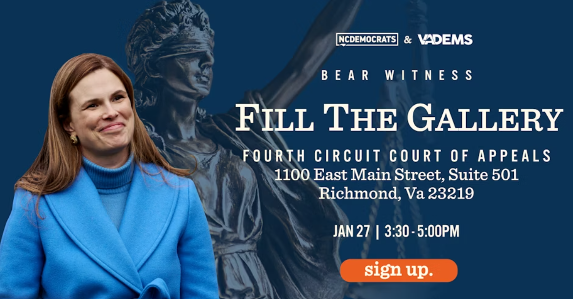 Democracy dies in darkness. We are partnering with the Virginia Democrats to make sure that members of the public attend oral arguments in the court case surrounding Republicans’ unconstitutional attempt to throw out over 60,000 ballots and overturn Justice Allison Riggs’ victory.