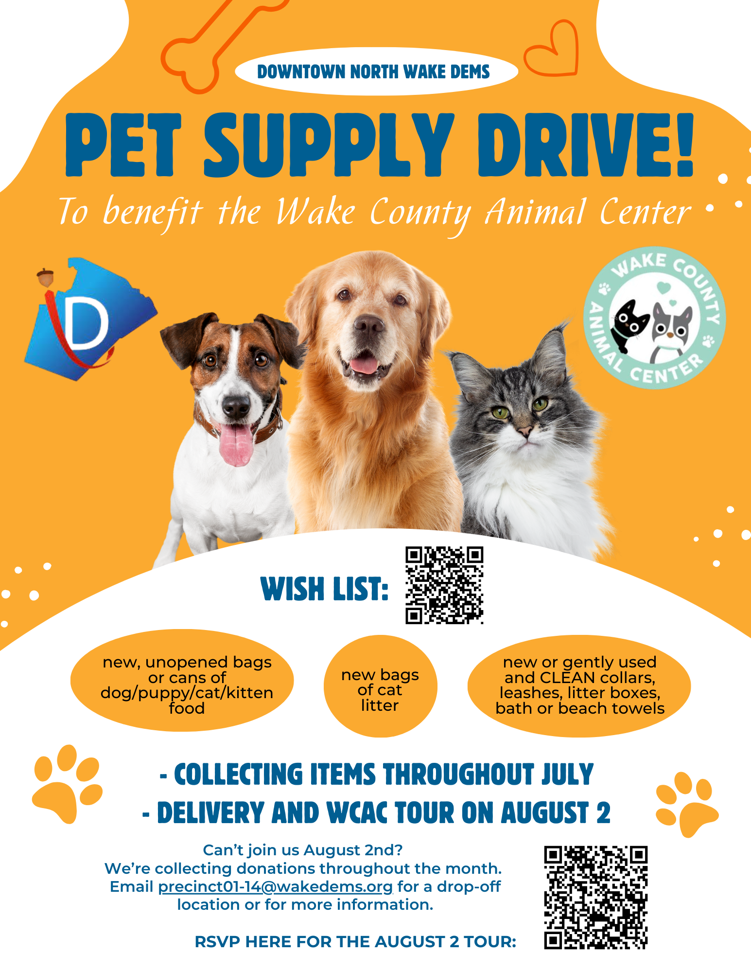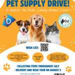 We’re collecting much needed pet food and supplies to benefit Wake County Animal Center (WCAC). Join us Saturday, August 2nd, to drop off your donations and join us for a photo and a tour. Register below to take a tour of the WCAC.
